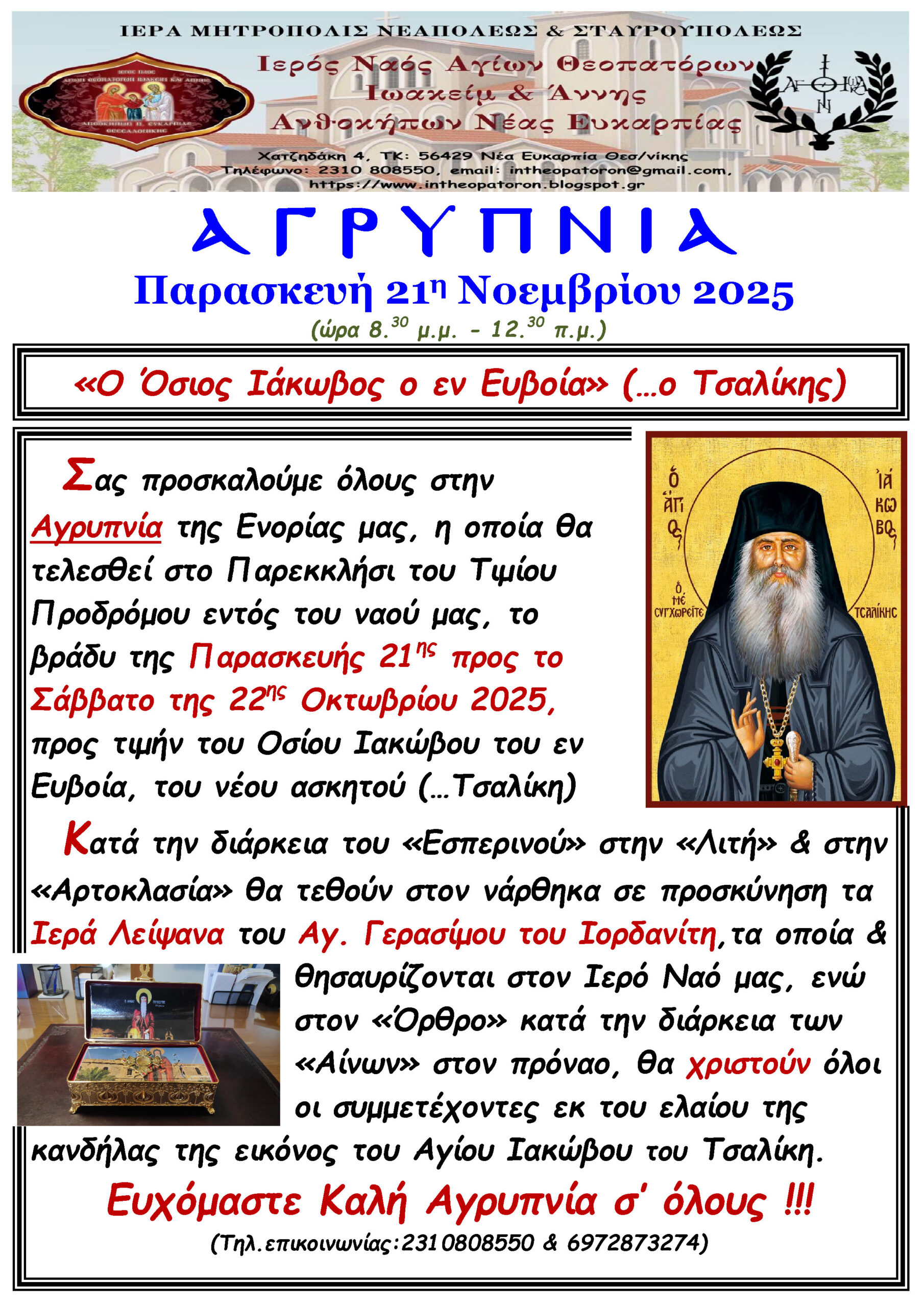 Ενοριακά Νέα Αγρυπνία Νοεμβρίου Ι.Ν.Αγίων Θεοπατόρων Ιωακείμ και Άννης Νέας Ευκαρπίας 26/03/2026 Posted by admin 08 Νοέ