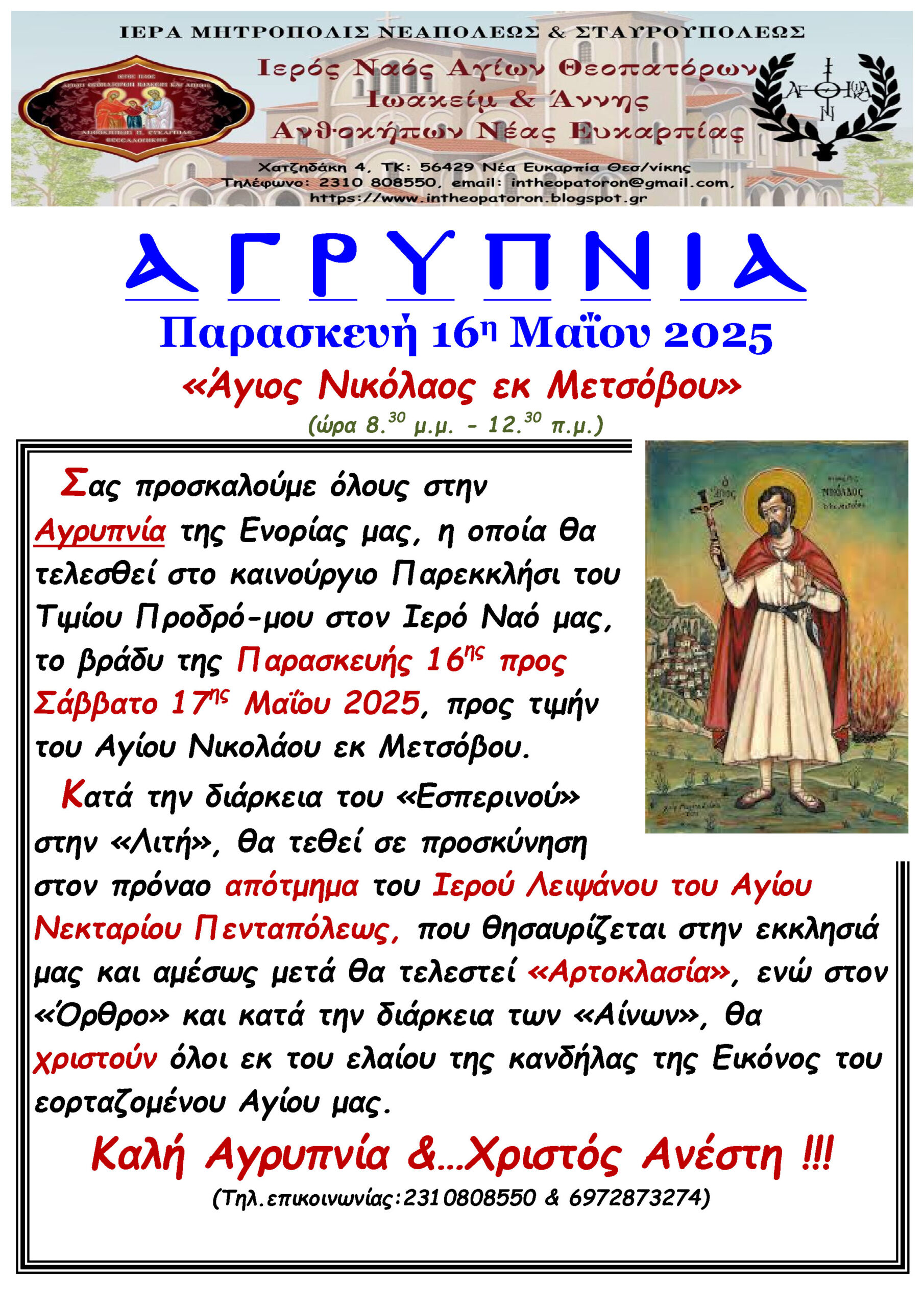 Ενοριακά Νέα Αγρυπνία Παρασκευή 16 Μαΐου 2025 Ιερός Ναός Αγίων Θεοπατόρων Ιωακείμ και Άννης Νέας Ευκαρπίας 26/03/2026 Posted by admin 04 Μάι