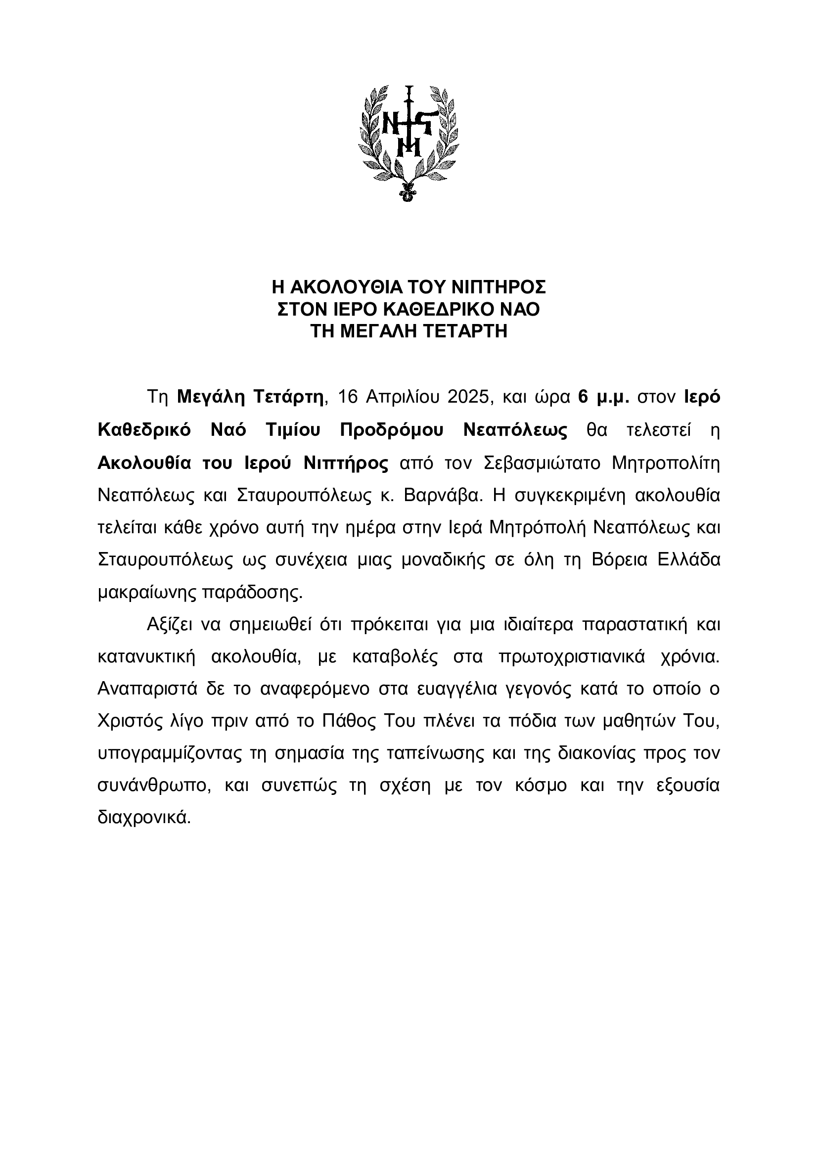 Ανακοινώσεις - Δελτία Τύπου, Μητροπολιτικά Νέα Ακολουθία Ιερού Νιπτήρος Μεγάλη Τετάρτη απόγευμα Καθεδρικός Ιερός Ναός Τιμίου Προδρόμου Νεαπόλεως 26/03/2026 Posted by admin 10 Απρ