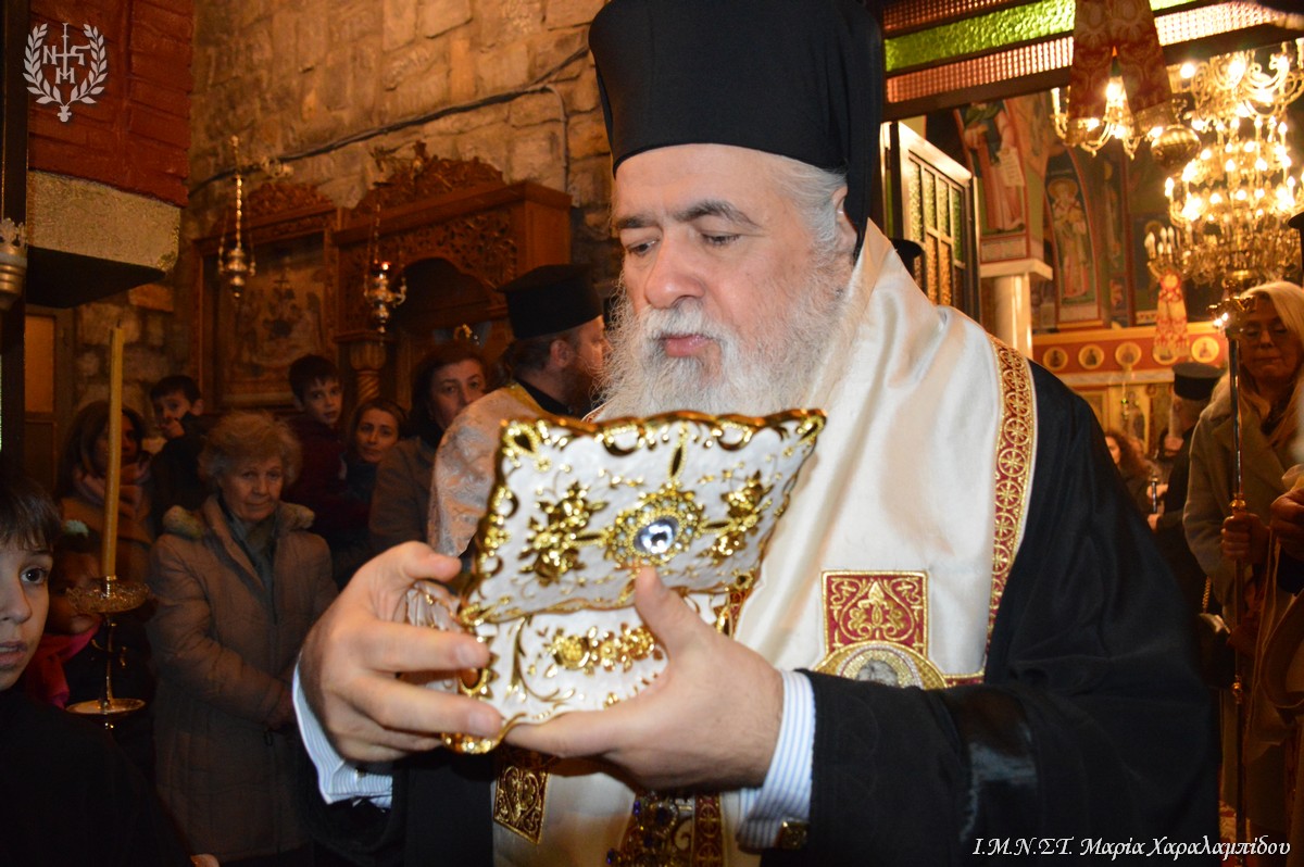 Λίγο νωρίτερα στην είσοδο του Ιερού Ναού ο Σεβασμιώτατος υποδέχθηκε απότμημα λειψάνου του Αγίου Πρωτομάρτυρος Στεφάνου το οποίο εκόμισε ο Πανοσιολογιώτατος Αρχιμανδρίτης π. Συμεών Παπαγεωργίου.
