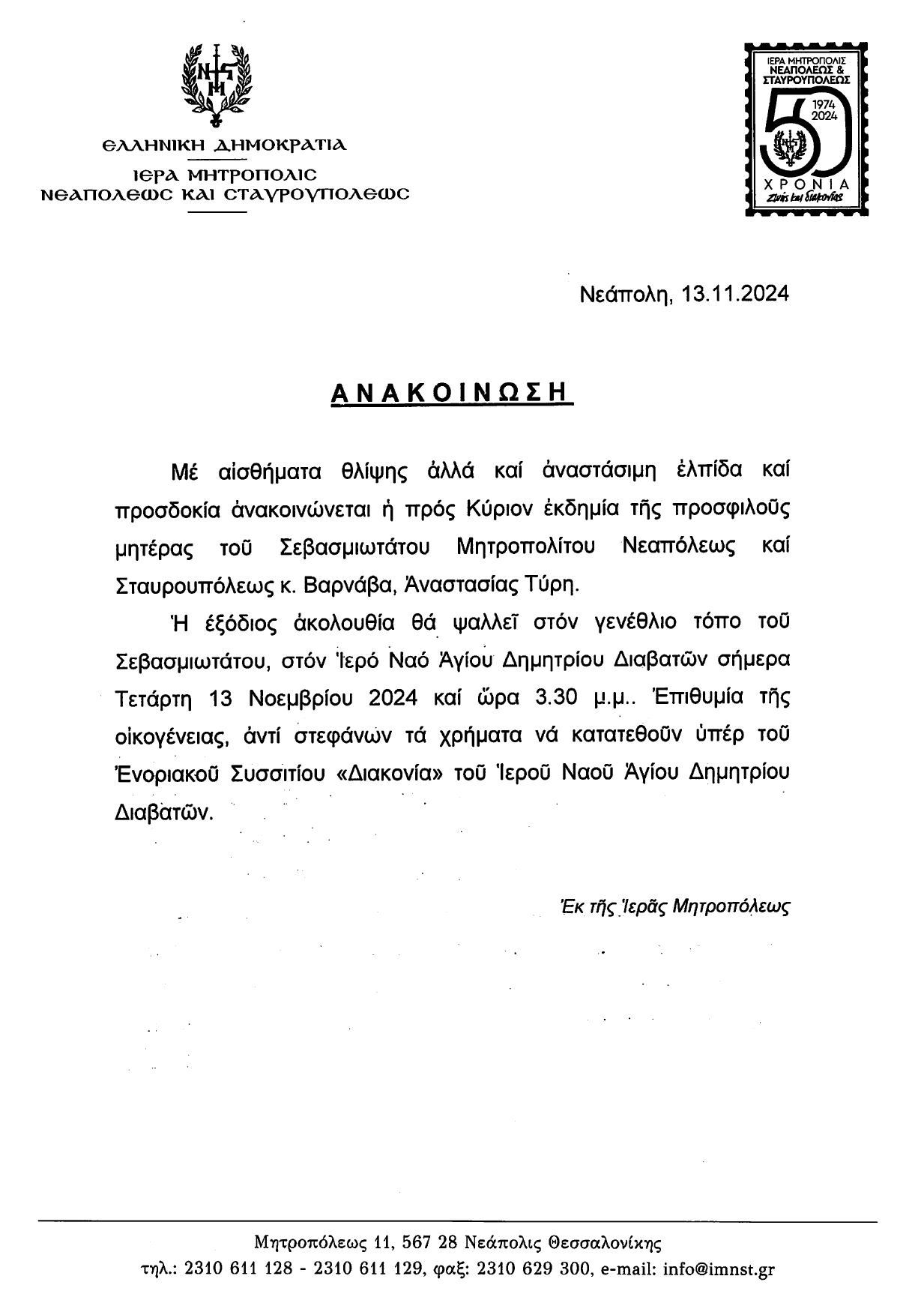 Ανακοινώσεις - Δελτία Τύπου Εκδημία μητέρας Σεβασμιωτάτου Μητροπολίτου Νεαπόλεως και Σταυρουπόλεως κ.Βαρνάβα 25/02/2025 Posted by admin 13 Νοέ
