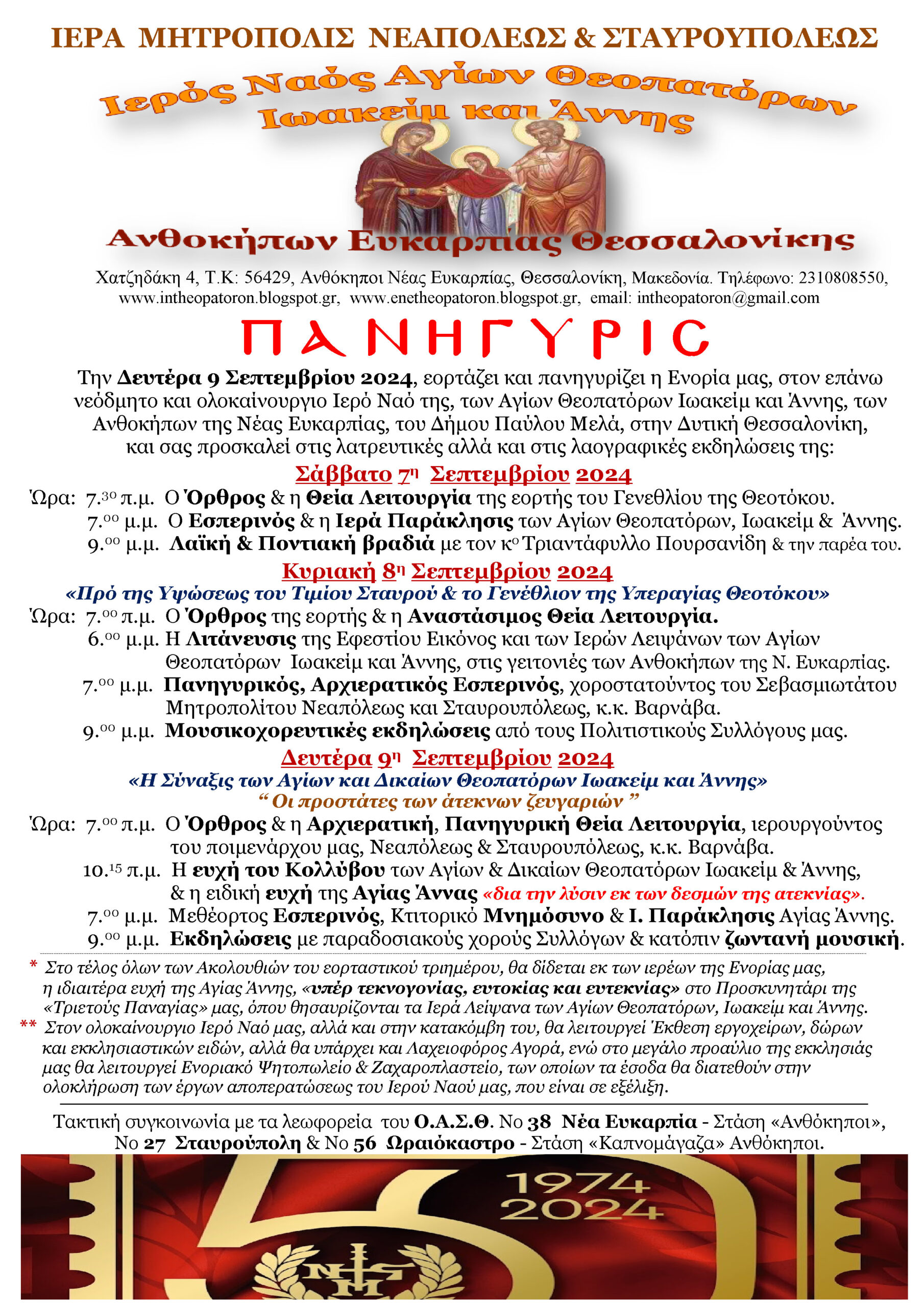 Ενοριακά Νέα Ιερά Πανήγυρις Ιερού Ναού Αγίων Θεοπατόρων Ιωακείμ και Άννης Ν.Ευκαρπίας 15/02/2025 Posted by admin 07 Σεπ
