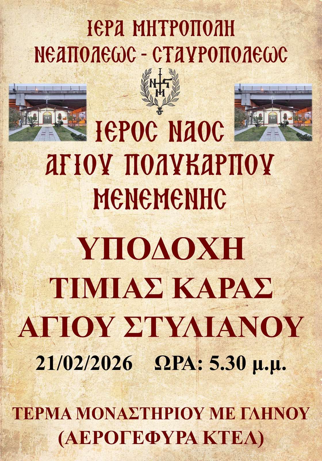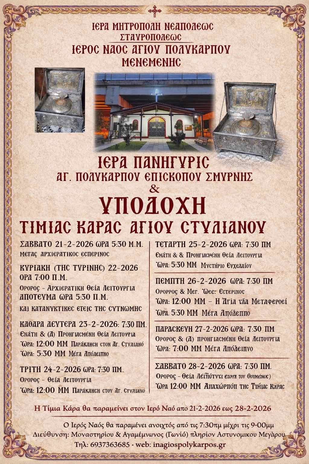 Ιερός Ναός Αγίου Πολυκάρπου Μενεμένης- Ιερά Πανήγυρις Αγίου Πολυκάρπου Επισκόπου Σμύρνης και Υποδοχή Τιμίας Κάρας Αγίου Στυλιανού- Πρόγραμμα