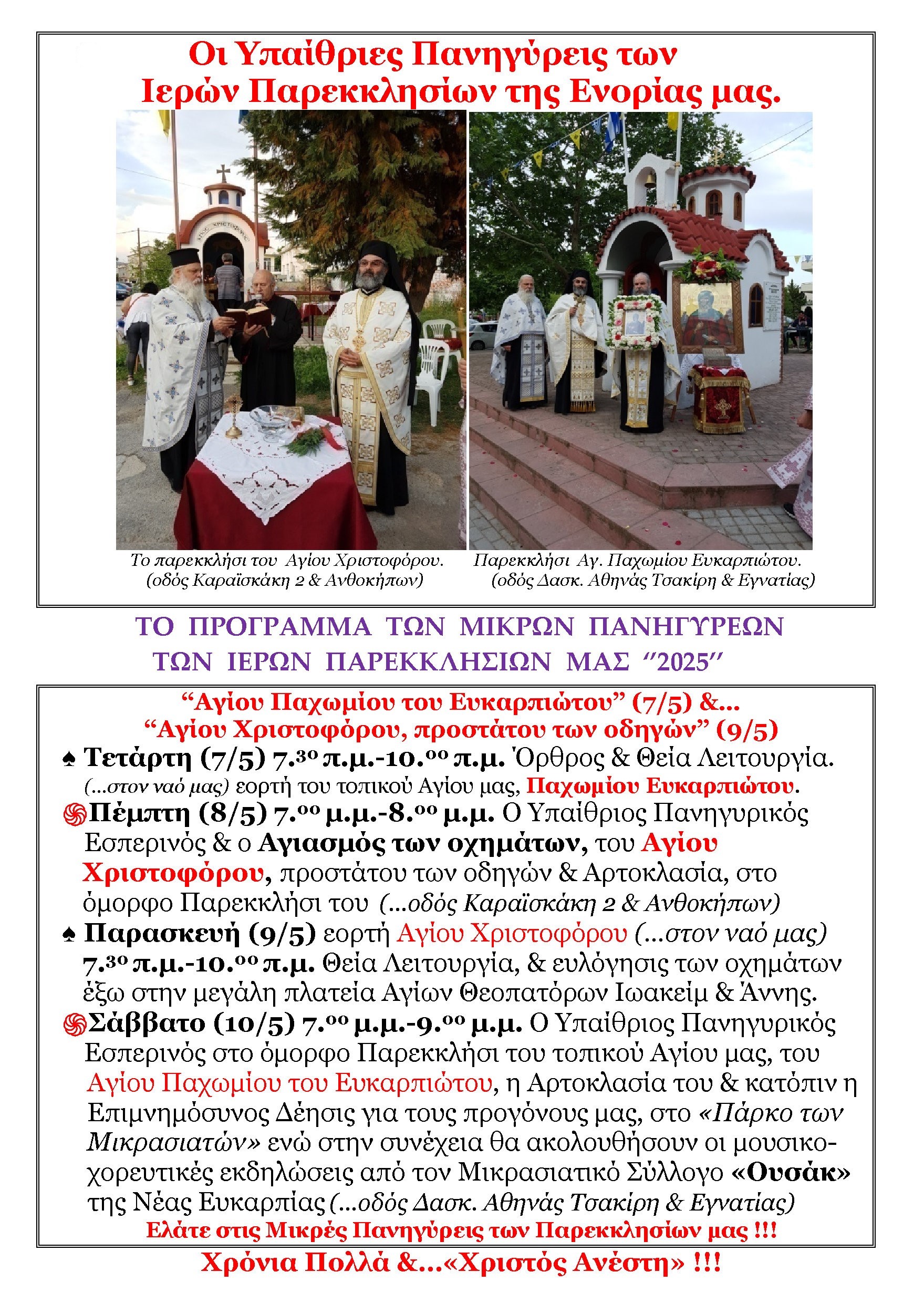 Ενοριακά Νέα Ιερός Ναός Αγίων Θεοπατόρων Ιωακείμ και Άννης Νέας Ευκαρπίας- Υπαίθριες Πανηγύρεις Ιερών Παρεκκλησίων της ενορίας 26/03/2026 Posted by admin 04 Μάι