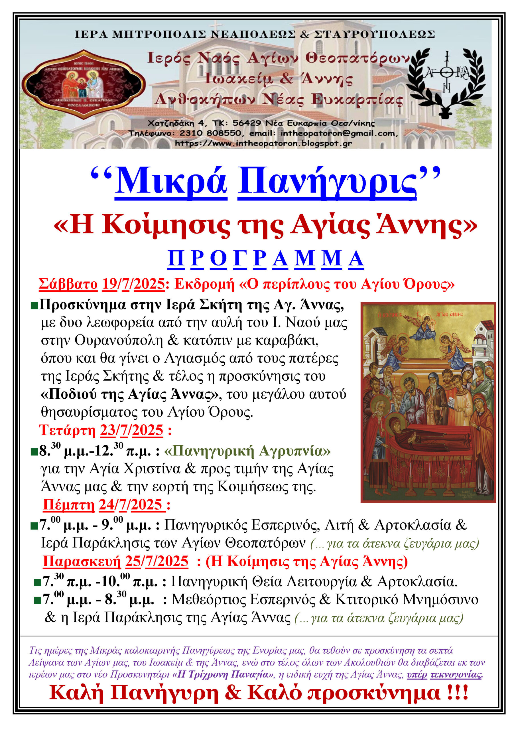 Ενοριακά Νέα “Μικρά Καλοκαιρινή Πανήγυρις” Ι.Ν.Αγίων Θεοπατόρων Ιωακείμ και Άννης “Η Κοίμησις της Αγίας Άννης” 26/03/2026 Posted by admin 21 Ιούλ