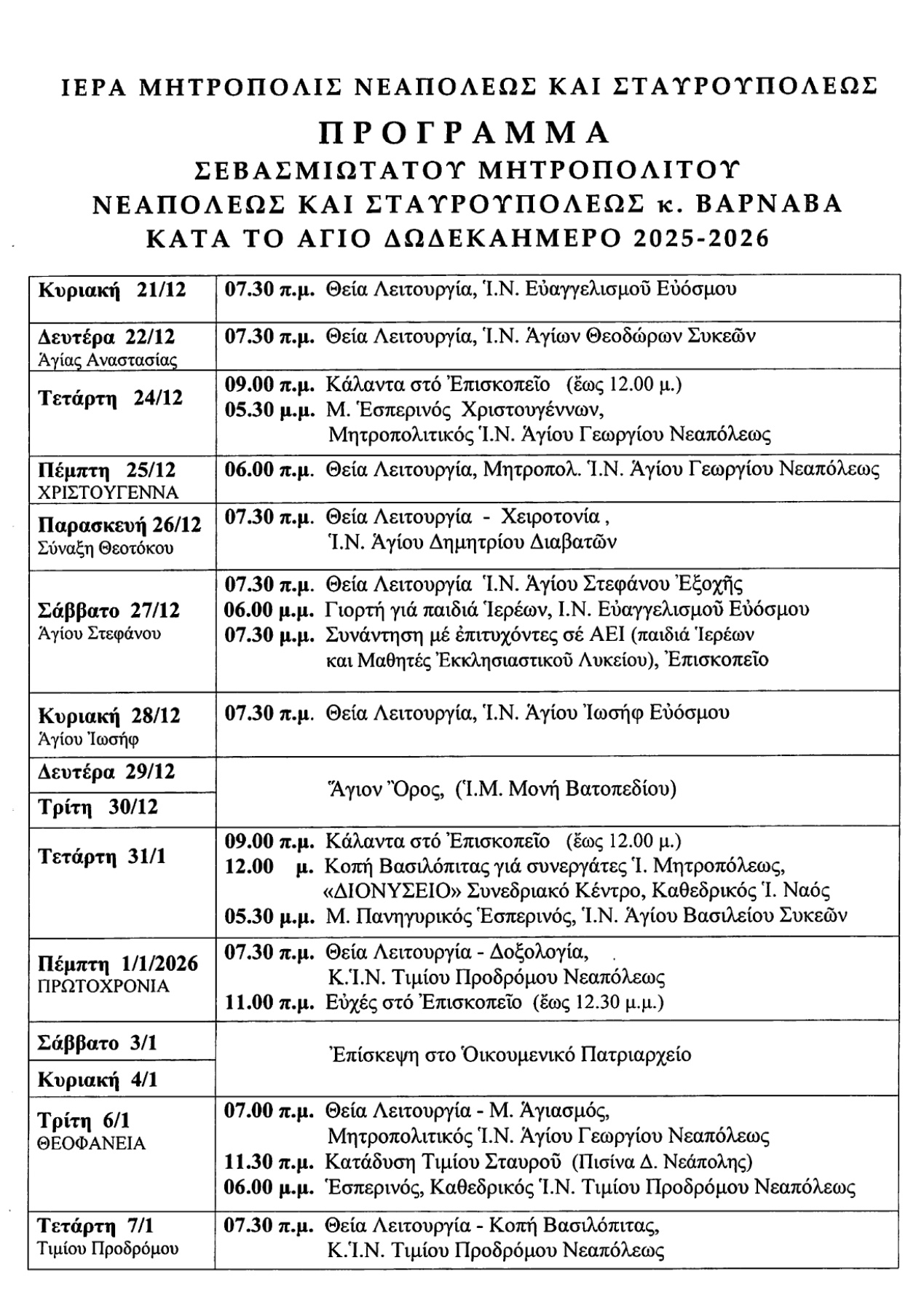 Πρόγραμμα Σεβασμιωτάτου Δωδεκαημέρου