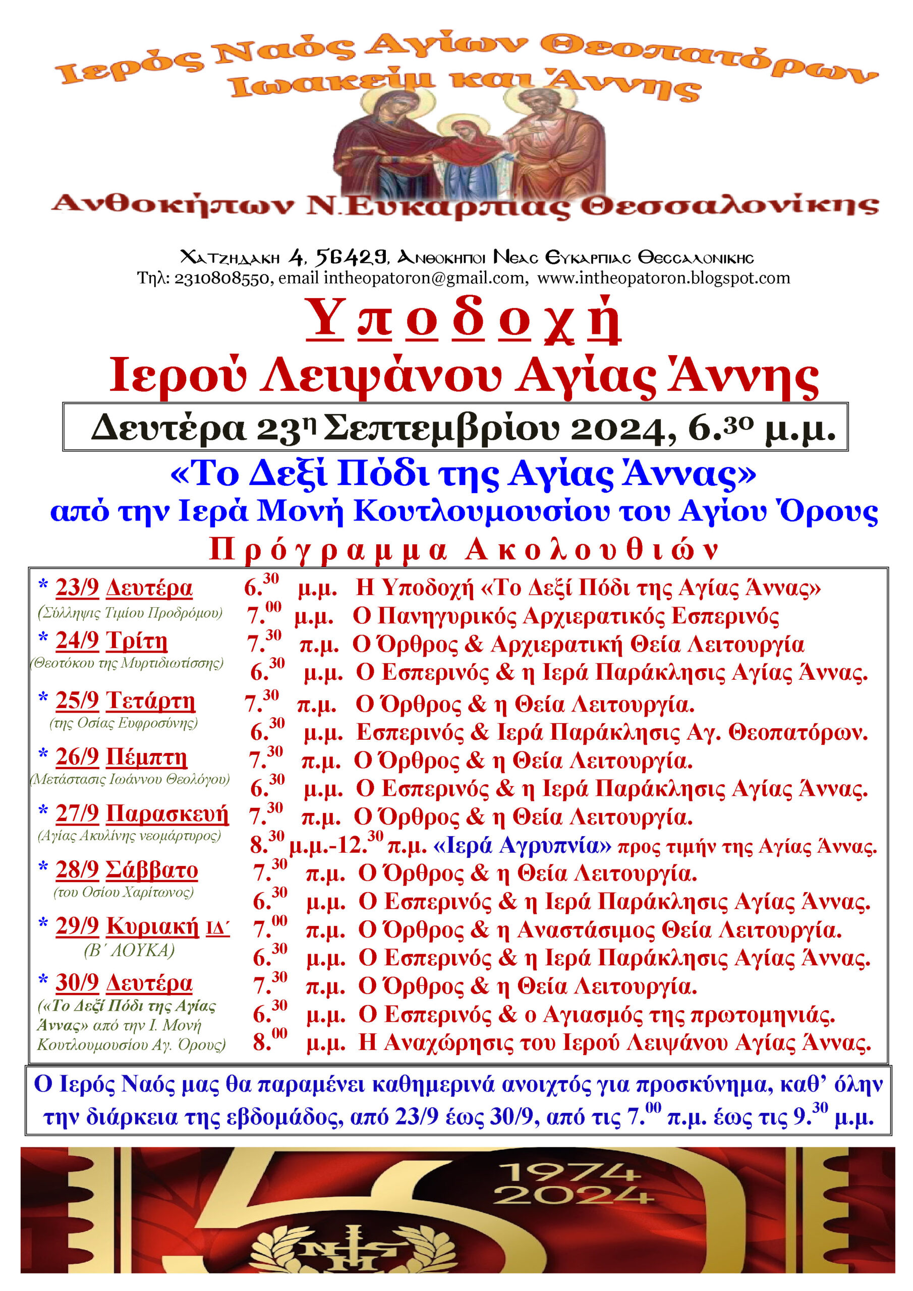 Ενοριακά Νέα Υποδοχή Ιερού Λειψάνου Αγίας Άννας στον Ιερό Ναό Αγίων Θεοπατόρων Ιωακείμ και Άννης Ν.Ευκαρπίας 15/02/2025 Posted by admin 07 Σεπ