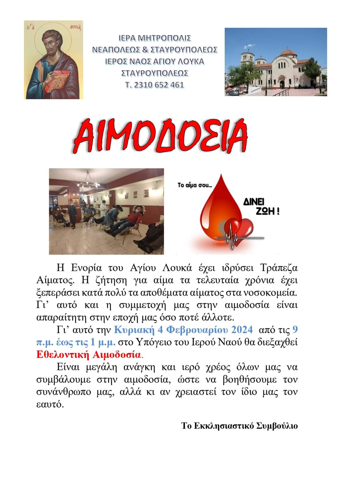 Ενοριακά Νέα Αιμοδοσία Ι.Ν.Αγίου Λουκά Σταυρουπόλεως Κυριακή 4 Φεβρουαρίου 2024 12/03/2025 Posted by xk 23 Ιαν
