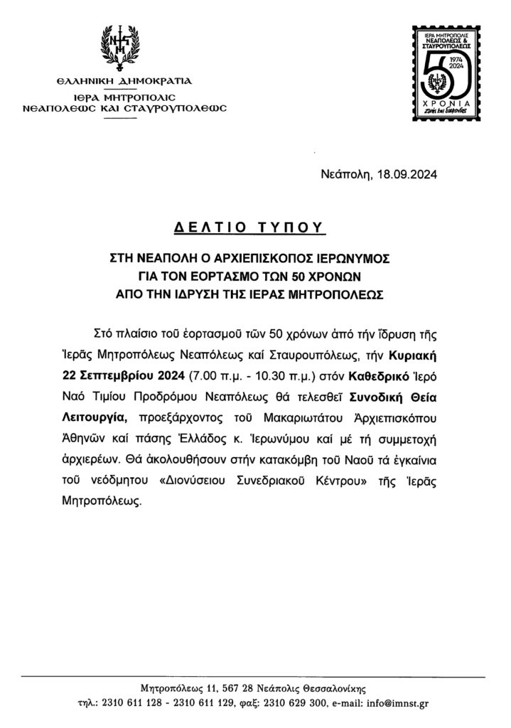 18 Σεπ Ανακοινώσεις - Δελτία Τύπου Στην Ιερά Μητρόπολη Νεαπόλεως ο Αρχιεπίσκοπος Ιερώνυμος για τον εορτασμό των 50 χρόνων από την ίδρυση της Ιεράς Μητροπόλεως 25/02/2025 By admin Περισσοτερα