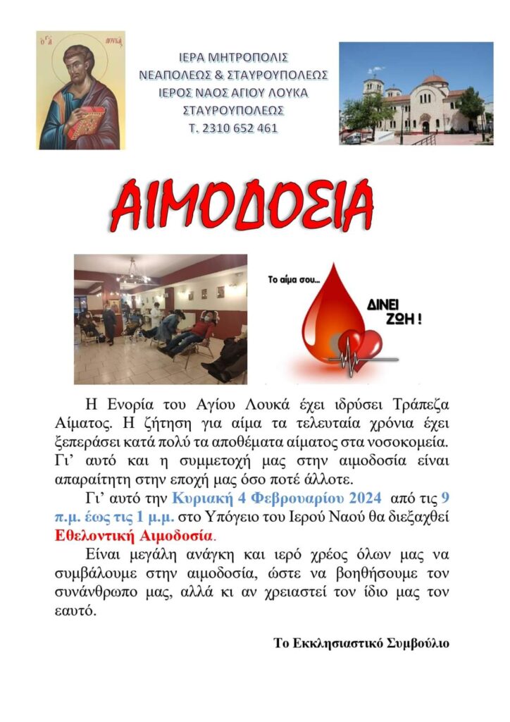 23 Ιαν Ενοριακά Νέα Αιμοδοσία Ι.Ν.Αγίου Λουκά Σταυρουπόλεως Κυριακή 4 Φεβρουαρίου 2024 12/03/2025 By xk Περισσοτερα