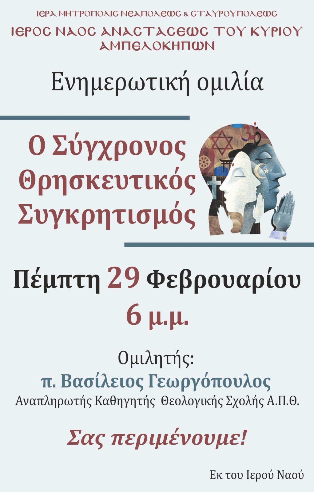 Ενοριακά Νέα Ομιλία Ι.Ν.Αναστάσεως του Κυρίου Αμπελοκήπων Πέμπτη 29 Φεβρουαρίου 6.00 μ.μ. 11/03/2025 Posted by xk 29 Φεβ