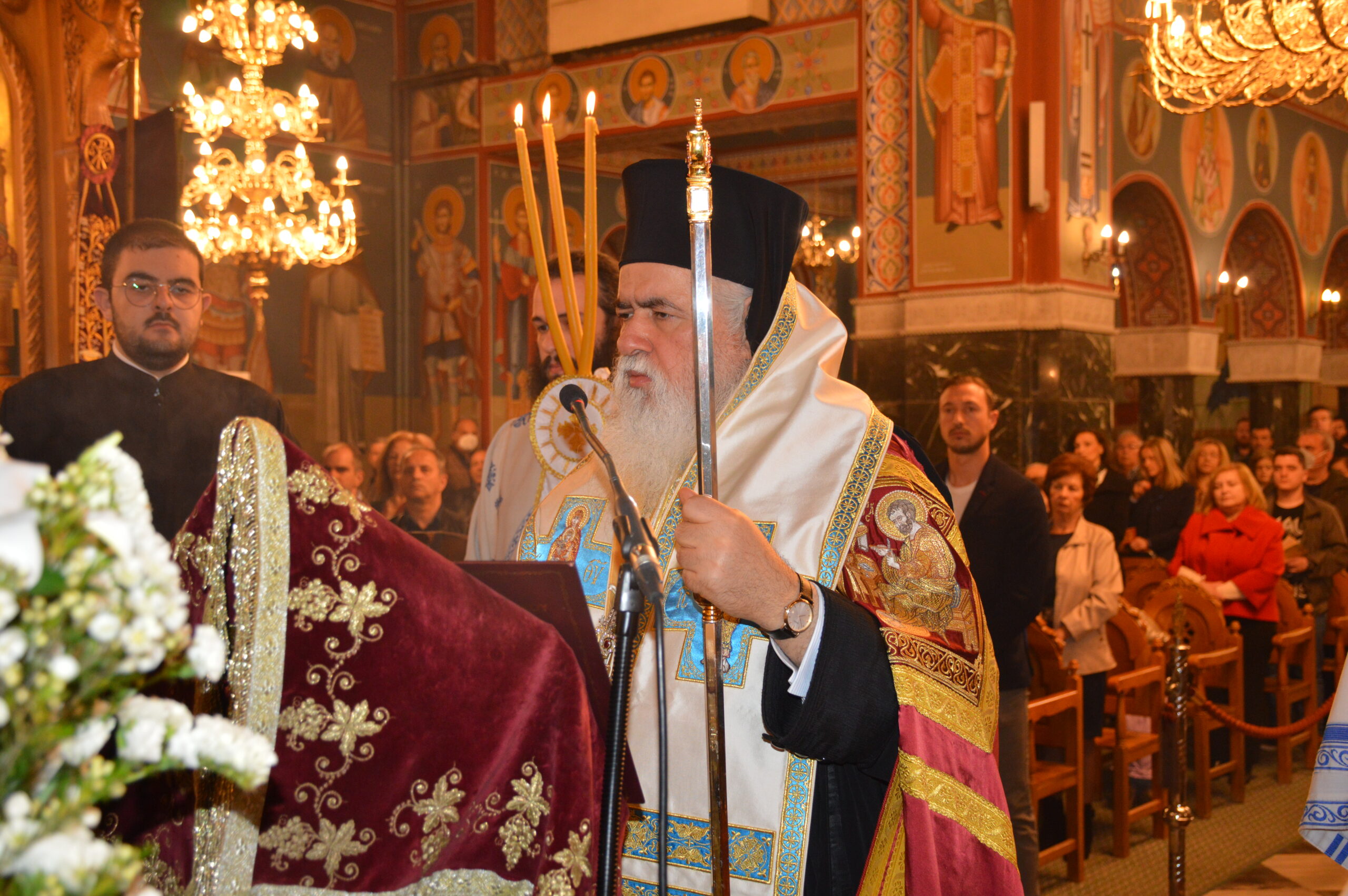 « Χαίρε, πύρινε στύλε οδηγών τοις εν σκότει», με σκαλωσιά αυτόν τον στίχο οικοδόμησε ο Σεβασμιώτατος το λόγο του υπογραμμίζοντας την καθοδηγητική παρουσία της Υπεραγίας Θεοτόκου.